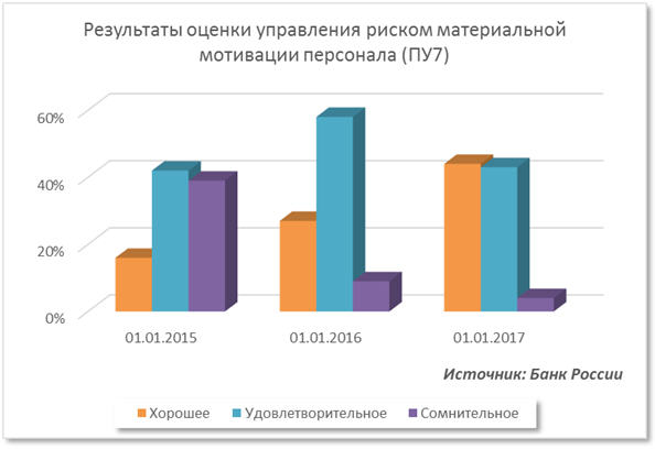 Правда, из последнего отчета Банка России об итогах развития банковского сектора следует, что в 2016 году существенно снизилась доля кредитных организаций, качество управления риском материального стимулирования (ПУ7) в которых оценивалось как сомнительное. Однако, значительная часть банков – немногим менее 50% - по-прежнему имеют показатель ПУ7 на уровне удовлетворительного. Это означает, что существующие системы материальной мотивации персонала во многих кредитных учреждениях могут быть усовершенствованы.