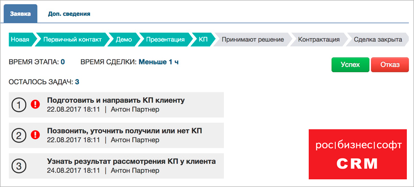 В свою очередь, руководители видят сколько времени находится Заявка или Сделка на определенном этапе «воронки», и при необходимости система может автоматически уведомить их о «зависании» процесса.