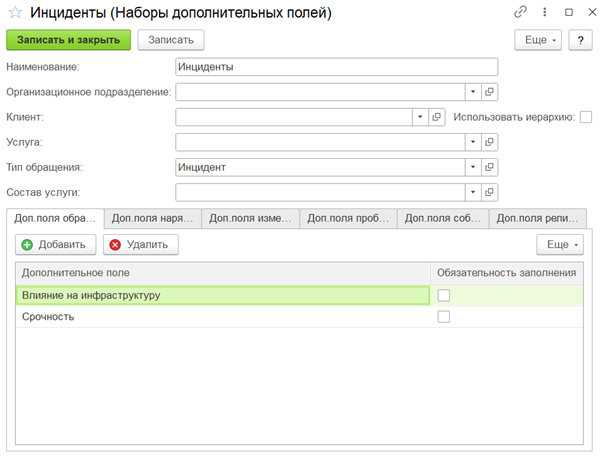 В релизе 1.0.1.9 проработана гибкая настройка дополнительных полей, которая позволяет адаптировать форму обращения под конкретный тип задачи. Для каждого случая — будь то инцидент или запрос на изменение — можно настроить отображение только тех полей, которые действительно необходимы для работы. Например, для инцидентов могут выводиться параметры «Срочность» и «Влияние на инфраструктуру», а для запросов на изменение — «Кейс использования» и «Оценка влияния».