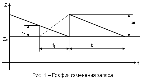 Согласно схеме, приведенной на рис.1, текущий запас состоит из двух частей: постоянной составляющей (страхового запаса Zc) и переменной. Предполагается, что происходит периодическое пополнение запаса партиями объектов величиной m. Затем каждая такая партия расходуется с некоторой скоростью в течение периода ts, а к моменту полного израсходования происходит новое пополнение.