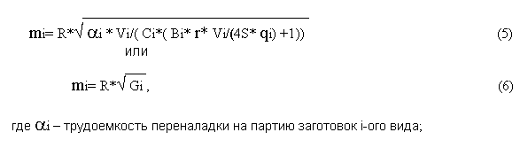Величина размера оптимальной партии заготовок i-ого вида mi определяется как решение многокритериальной задачи оптимизации по критериям трудоемкость производства T – стоимость C незавершенного производства заготовок, т.е. по компромиссной кривой т.н. TC –диаграммы [1]. Точки этой кривой описываются уравнениями оптимальности: