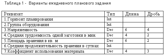 Затем составляется каталог материалов по первому упоминанию материала в наборе отобранных строк и сортируется по дате начала изготовления. По этому каталогу проводится цикл, в рамках которого по каждому материалу объединяются строки таблицы плана с текущим материалом в одну партию завоза. В специальную таблицу записываются параметры партии завоза. Дата завоза – это дата, на которую проводится планирование, время завоза определяется по моменту освобождения хотя бы одного станка необходимой группы оборудования. Для оценки вариантов плана составляется табл1.