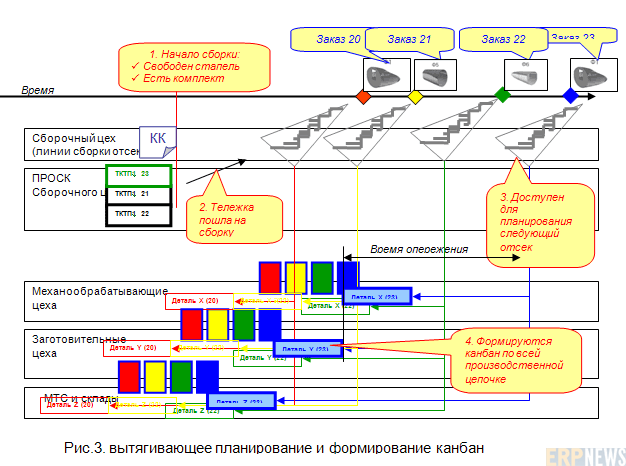 4. Далее, для первых из цепочки производства деталей для данного заказа цехов, в системе формируется план производства на количество деталей, соответствующих конкретным заказам (номерам машин), которые определяются количеством карточек канбан в обращении. Таким образом, каждый новый головной заказ «вытягивает» необходимое количество деталей к производству (см. рис. 3)