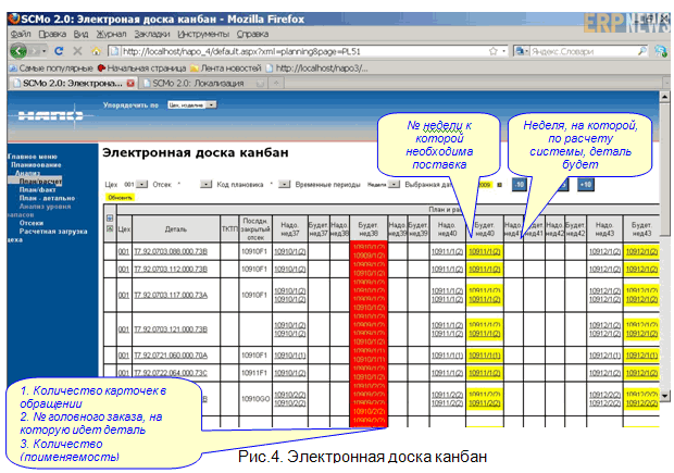 3. Сразу же, в системе, становится доступным для планирования следующее, по последовательности отгрузки, готовое изделие (следующий заказ). Запускается функция планирования, при отработке которой проверяется: количество карточек канбан в обращении для каждой из деталей отсека, количество деталей в производстве и на складах.