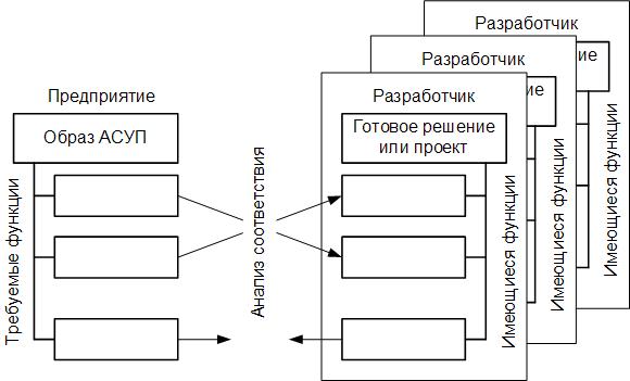 Для этого должен быть составлен функциональный образ той системы, которая должна быть на предприятии. И уже в дальнейшем этот образ предполагаемой АСУП необходимо сравнивать с функциональностью тех или иных готовых решений или предлагаемых проектов (рис.1) с учетом ценовой политики и возможности использования тех или иных модулей АСУП уже на этапе внедрения.