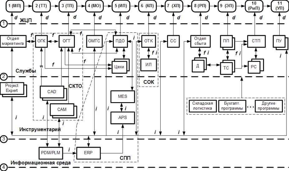 Между элементами системы имеются связи различных типов – директивные (d), которые указывают на непосредственное отношение тех или иных служб к этапам ЖЦП, функциональные (f), которые оговаривают возможность согласования решений между службами и информационные (i), которые показывают наличие тех или иных информационных потоков между элементами системы.