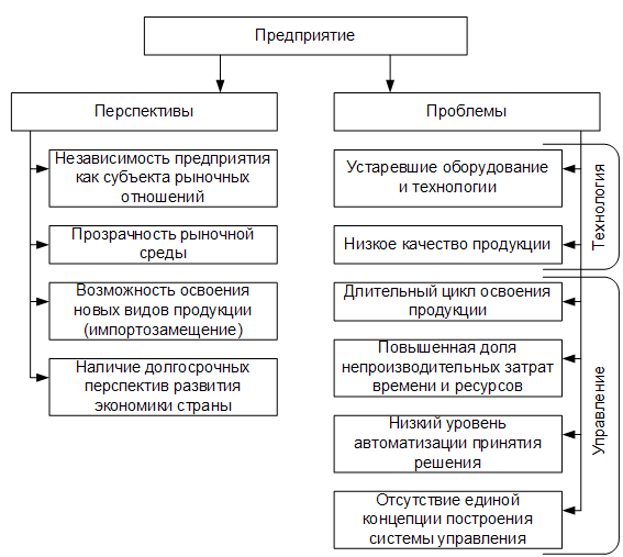 Если проанализировать современное предприятие с точки зрения перспектив и проблем (рис.1), то мы видим, что основные задачи, кроме традиционных, связанных с переоснащением, модернизацией производства и повышением качества продукции, лежат в плоскости оперативного реагирования и принятия оптимального решения, т.е. в наличии адекватной системы управления предприятием.