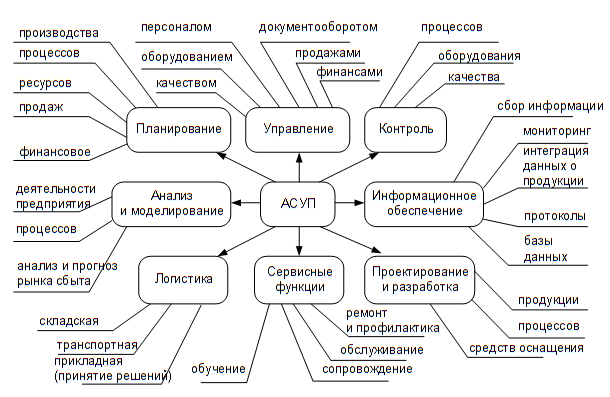 К основным функциям современных АСУП можно отнести следующие (рис.2): анализ и моделирование; планирование; управление; контроль; проектирование и разработка; информационное обеспечение; логистика; сервисные функции. На рис.2 показаны лишь наиболее часто встречающиеся функции АСУП и их содержание, полный перечень может содержать, в зависимости от уровня автоматизации предприятия, более сотни позиций.