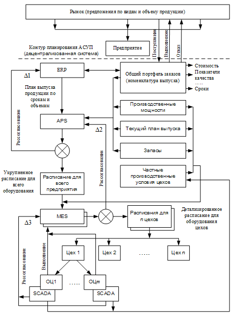 Таким образом, мы видим, что система планирования производственных процессов на предприятии может быть организована за счет системной организации трехконтурной распределенной архитектуры – ERP→APS, APS→MES, MES→SCADA с обратной связью и соответствующих параметров рассогласования для каждого уровня Δ1, Δ2 и Δ3, на основании которых верхний уровень принимает решения о корректировке плановых директив для нижнего уровня. Так, например, рассогласования Δ3, поступающие со SCADA-систем, заставляют MES-систему в ряде случаев пересчитывать расписания. Рассогласования Δ2, поступающие с MES-систем, заставляют APS-системы либо уменьшить нагрузку на цеха (в случае невыполнения заказов в указанные сроки), либо пересчитать директивные сроки, рассогласования Δ1, поступающие с APS-системы, заставляют отказаться от тех или иных заказов либо пересмотреть сроки поставок со стороны заказчиков.