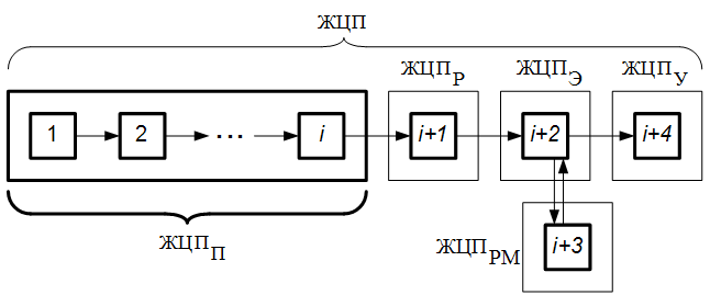 При этом весь ЖЦП состоит из нескольких этапов (рис.4): ЖЦПП –ЖЦП на этапе производства продукции (этап предприятия); ЖЦПР – ЖЦП на этапе реализации продукции (этап дистрибуции, реализации продукции); ЖЦПЭ –ЖЦП на этапе эксплуатации продукции (этап потребителя); ЖЦПРМ –ЖЦП на этапе ремонта продукции (этап восстановления и ремонта продукции); ЖЦПУ –ЖЦП на этапе утилизации продукции (этап утилизации). За каждый из этих этапов отвечают различные структуры – производители, предприятия торговли, ремонтные предприятия, потребители и предприятия, отвечающие за утилизацию продукции.