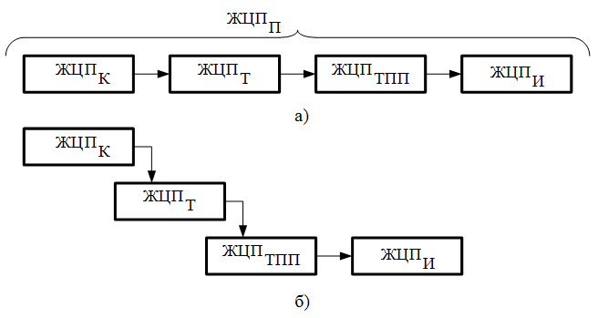 Если проанализировать этап ЖЦПП, то окажется, что он состоит не только из механической обработки и сборки продукции. Непосредственно изготовления продукции предшествуют этапы интеллектуального характера. Если не учитывать этап маркетинга, этап ЖЦПП, укрупнено, включает в себя следующие основные этапы (рис.5.а): этап конструкторской разработки изделия – ЖЦПК, этап разработки технологического процесса – ЖЦПТ, этап технологической подготовки производства – ЖЦПТППи непосредственно сам этап изготовления продукции – ЖЦПИ. Таким образом, упорядочению и планированию с целью сокращения общей длительности этапа ЖЦППподлежит не только цикл механической обработки (изготовления), но также все предшествующие ему этапы. При этом между этими этапами зачастую возникает сложная взаимосвязь во времени, обусловленная порядком выполнения всего комплекса работ, принятыми на предприятии особенностями организации производства. Могут встречаться как строго последовательные варианты этапов (рис.5.а), так и с перекрытием во времени (рис.5.б).