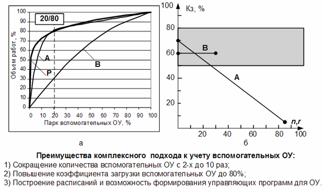 В ряде MES-систем возможно составление расписаний не только для ОЦ, но также для транспортных средств и бригад наладчиков, т.е. MES-системы позволяют оперировать классами обслуживающих устройств. Исследования показали, что в автоматизированных производственных системах характер обслуживания ОЦ транспортными средствами (ТС) при использовании традиционных методов построения расписаний подчиняется распределению Джурана-Парето (рис.7, А – традиционный вариант учета ТС, B– вариант учета в MESPolyPlan, Р – распределение Парето), доминирование которого ранее приписывалось исключительно социально-экономическим системам с возможностью самоорганизации.